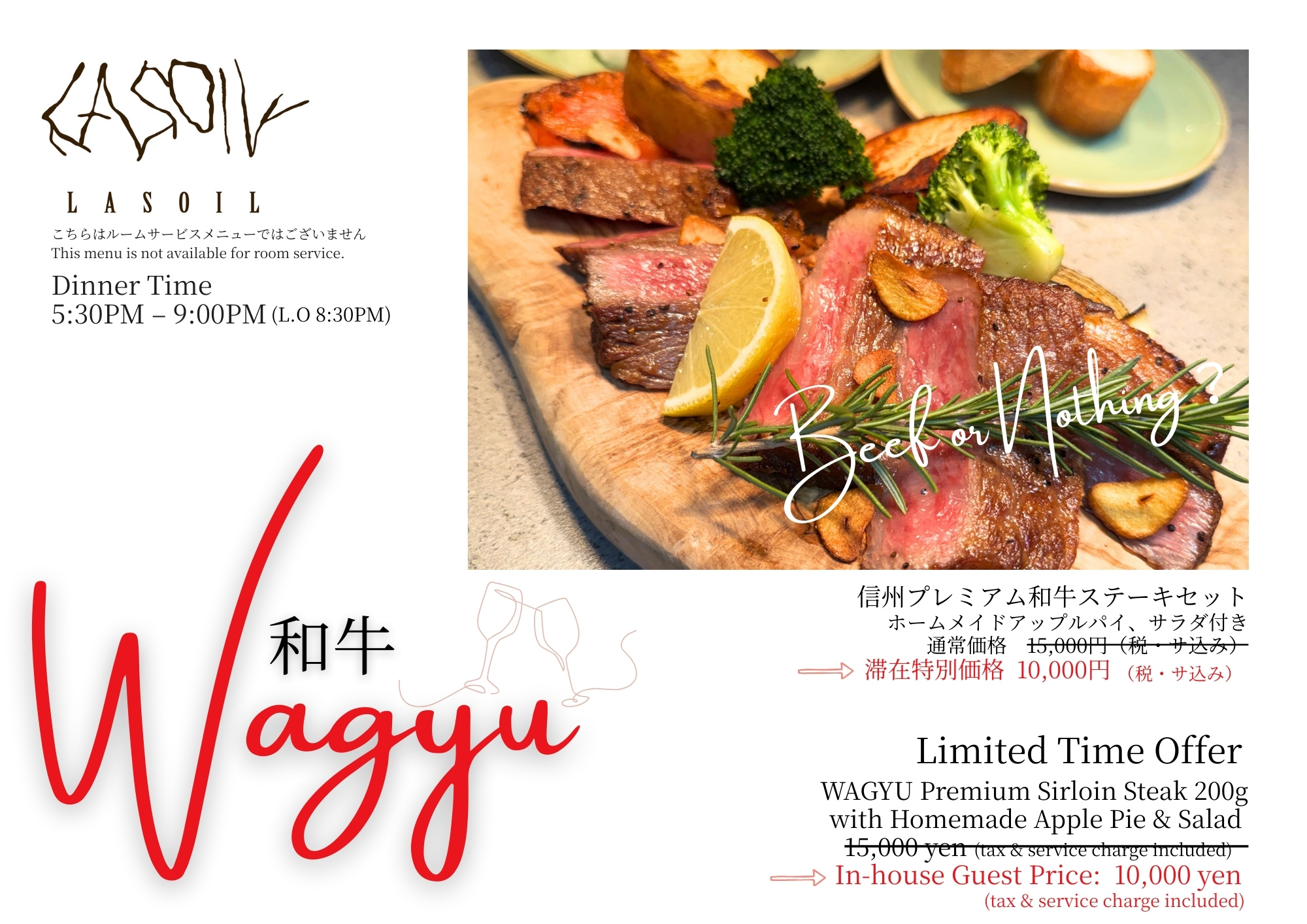 この冬だけの限定メニュー「信州プレミアム和牛ステーキセット」がホームメイドアップルパイ、サラダ付きで通常価格15,000円(税・サ込み)のところ滞在のお客様だけに特別価格でご案内。詳しくは下記リンクよりご覧ください。