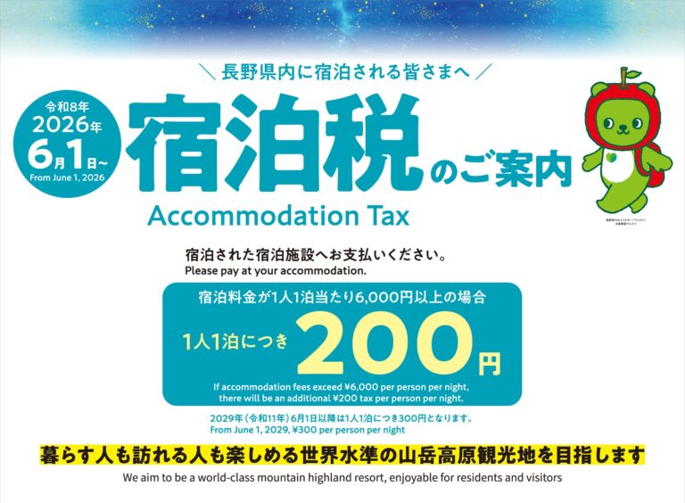 From 1 June 2026, an accommodation tax will be introduced at accommodation facilities throughout Nagano Prefecture.